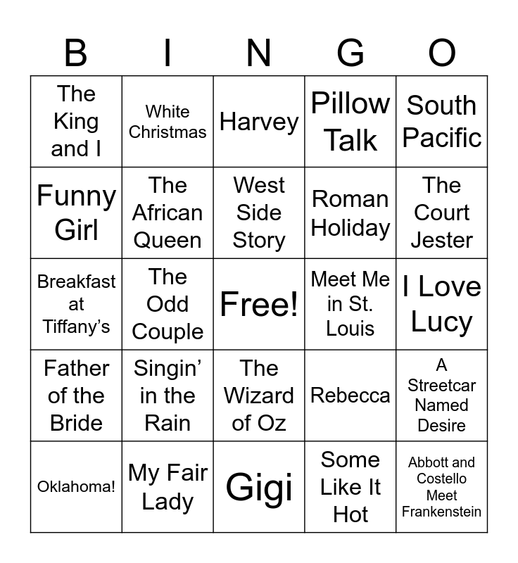 This bingo card has a free space and 24 words: Singin’ in the Rain, My Fair Lady, West Side Story, Oklahoma!, South Pacific, The King and I, Funny Girl, White Christmas, Meet Me in St. Louis, The Wizard of Oz, Roman Holiday, Breakfast at Tiffany’s, Rebecca, A Streetcar Named Desire, The African Queen, Some Like It Hot, I Love Lucy, Harvey, The Court Jester, The Odd Couple, Abbott and Costello Meet Frankenstein, Father of the Bride, Pillow Talk and Gigi.