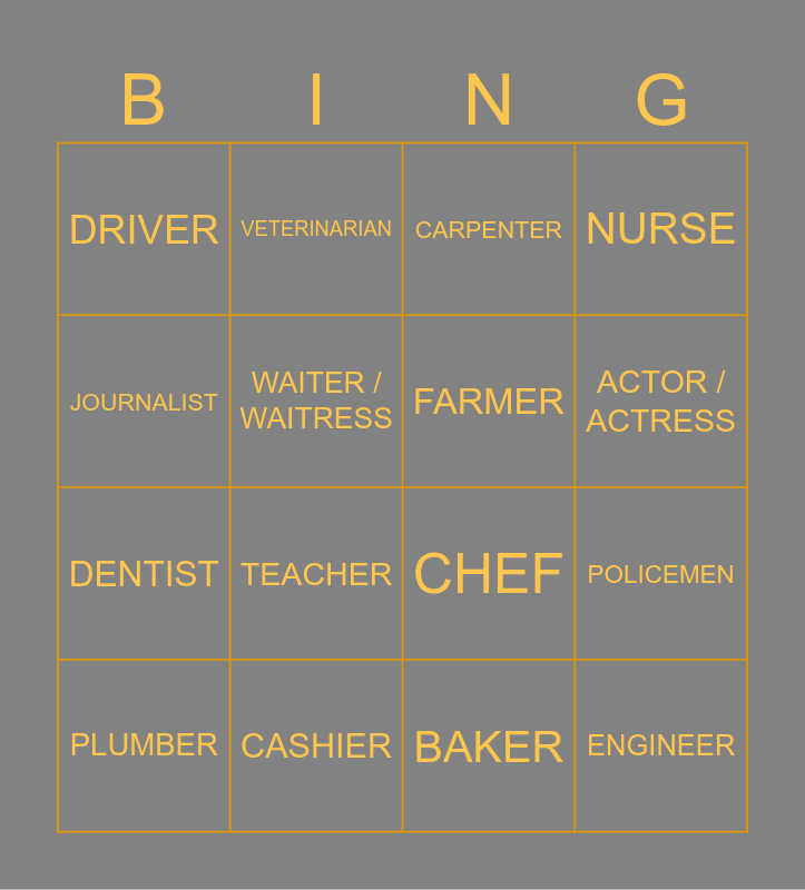 This bingo card has 20 words: POLICEMEN, BARBER, CARPENTER, SOLDIER, PLUMBER, JOURNALIST, CASHIER, DRIVER, DENTIST, VETERINARIAN, TEACHER, CHEF, WAITER / WAITRESS, ENGINEER, FARMER, JANITOR, ACTOR / ACTRESS, NURSE, BAKER and secretary.