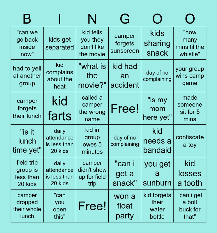 This bingo card has 39 words: "can you open this", camper dropped their whole lunch, kid calls you mom or dad, had to yell at another group, kid in group owes 5 minutes, made someone sit for 5 mins, kid complains about the heat, "can i get a bolt buck for that", kids sharing snack, Free!, your group wins camp game, camper forgets sunscreen, camper forgets their lunch, called a camper the wrong name, kid farts, "is my mom here yet", you get a sunburn, "can we go back inside now", Free!, "is it lunch time yet", "how many mins til the whistle", kid needs a bandaid, "what is the movie?", kid had an accident, won a float party, camper didn't show up for field trip, field trip group is less than 20 kids, kid forgets their water bottle, daily attendance is less than 20 kids, kids get separated, kid tell you a beach story, kid losses a tooth, kid tells you they don't like the movie, day of no complaining, confiscate a toy, "can i get a snack", daily attendance is less than 20 kids, day of no complaining and confiscate a toy.