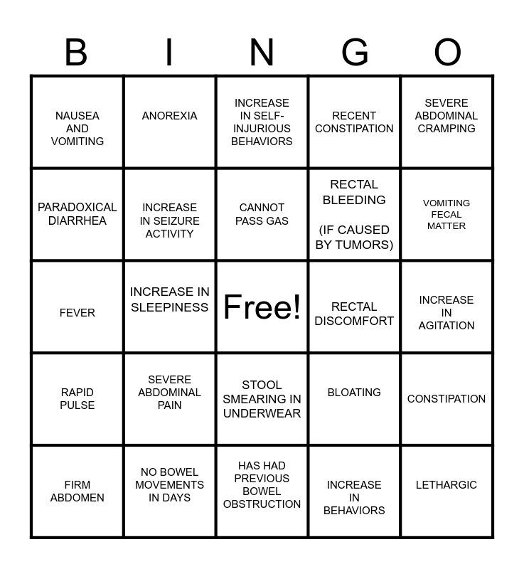 This bingo card has a free space and 24 words: SEVERE ABDOMINAL PAIN, NO BOWEL MOVEMENTS IN DAYS, CANNOT PASS GAS, FIRM ABDOMEN, SEVERE ABDOMINAL CRAMPING, NAUSEA AND VOMITING, PARADOXICAL DIARRHEA, ANOREXIA, RECTAL DISCOMFORT, STOOL SMEARING IN UNDERWEAR, RECTAL BLEEDING (IF CAUSED BY TUMORS), FEVER, BLOATING, CONSTIPATION, INCREASE IN SEIZURE ACTIVITY, INCREASE IN BEHAVIORS, INCREASE IN AGITATION, INCREASE IN SELF-INJURIOUS BEHAVIORS, VOMITING FECAL MATTER, INCREASE IN SLEEPINESS, LETHARGIC, RAPID PULSE, RECENT CONSTIPATION and HAS HAD PREVIOUS BOWEL OBSTRUCTION.