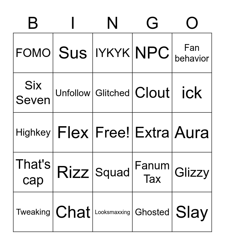 This bingo card has a free space and 100 words: Aesthetic, ASMR, Aura, Aura Farming, Ballerina Cappuccina, Basic, Bet, Bombardino Crocodilo, Boujee, Brainrot, Bruh, Canon event, Caught in 4K, Chat, Cheugy, Chicken Jockey, Clout, Cooked, Crash Out, Crazy Work, Cringe, Delulu, Diabolical, Dog Water, Drip, Extra, Fan behavior, Fanum Tax, Fire, Fit check, Flex, FOMO, FYP, Gaslighting, Ghosted, Glitched, Glizzy, Glow up, Goat(ed), Good Boy, Gucci, Gurt, Highkey, Hit Different, ick, IYKYK, Kevin, King, Let him cook, Looksmaxxing, Lowkey, Main character, Mewing, Mid, Mogging, Mood, No cap, Nonchalant, Noob, NPC, Ohio, OK Boomer, On God, One pound fish, Oof, Outta pocket, Periodt, POV, Queen, Real one, Rent Free, Rizz, Rizzler, Ship, Shook, Sigma, Simp, Six Seven, Skibidi, Skrrt, Slaps, Slay, Spilling tea, Squad, Stan, Sus, Take the L, Tbh, Tea, That's cap, Touch grass, Tralalero tralala, Tung Tung…Sahur, Tweaking, Unfollow, Vibe, W / L, Womp Womp, Yeet and Stand on Business.