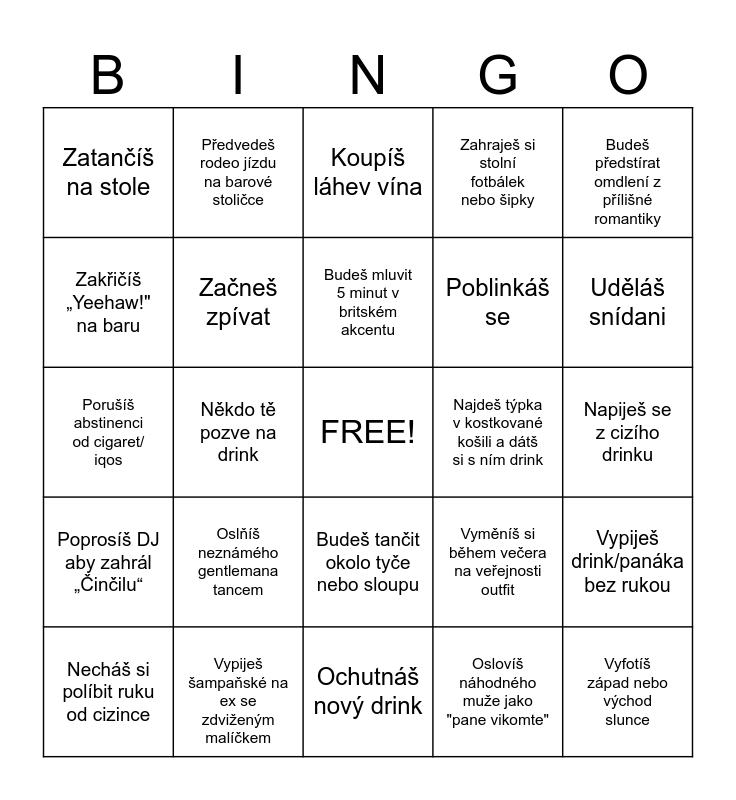 This bingo card has a free space and 24 words: Oslňíš neznámého gentlemana tancem, Vypiješ šampaňské na ex se zdviženým malíčkem, Budeš mluvit 5 minut v britském akcentu, Necháš si políbit ruku od cizince, Budeš předstírat omdlení z přílišné romantiky, Zatančíš na stole, Zakřičíš „Yeehaw!" na baru, Předvedeš rodeo jízdu na barové stoličce, Najdeš týpka v kostkované košili a dátš si s ním drink, Budeš tančit okolo tyče nebo sloupu, Poblinkáš se, Porušíš abstinenci od cigaret/ iqos, Vyměníš si během večera na veřejnosti outfit, Vypiješ drink/panáka bez rukou, Začneš zpívat, Oslovíš náhodného muže jako "pane vikomte", Napiješ se z cizího drinku, Koupíš láhev vína, Uděláš snídani, Někdo tě pozve na drink, Vyfotíš západ nebo východ slunce, Poprosíš DJ aby zahrál „Činčilu“, Zahraješ si stolní fotbálek nebo šipky and Ochutnáš nový drink.