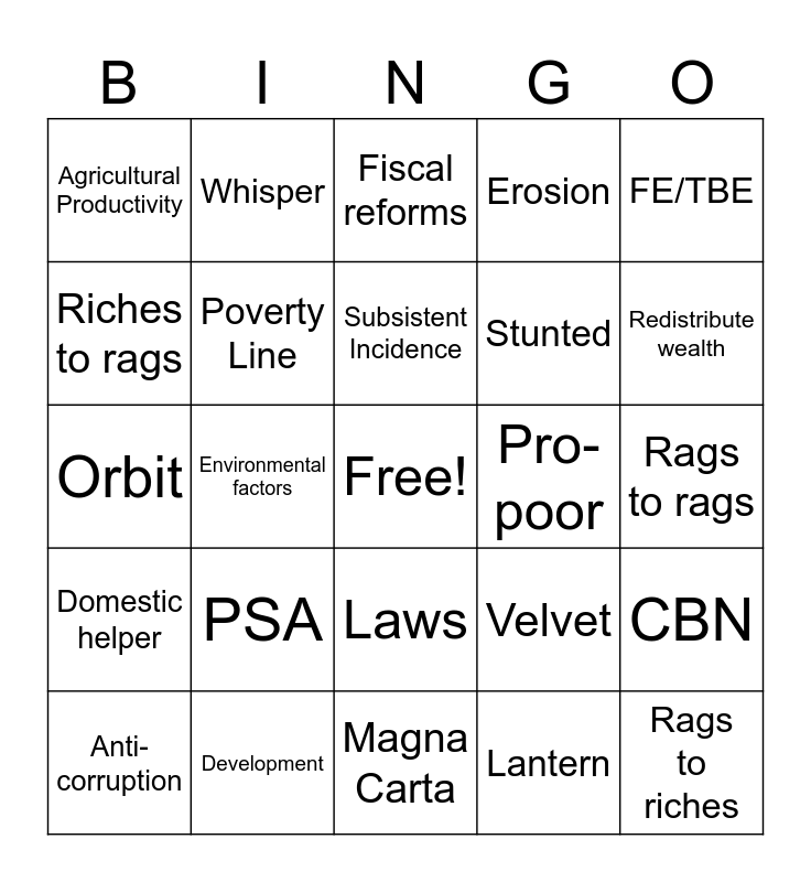 This bingo card has a free space and 38 words: Financial resources, Insufficient, Access, Poverty Line, CBN, PSA, Subsistent Incidence, Provincial food bundle, FE/TBE, Stunted, Environmental factors, Erosion, Rags to riches, Rags to rags, Riches to rags, Domestic helper, Vices, Fiscal reforms, Sustainable Livelihood, Pro-poor, Agricultural Productivity, Development, Redistribute wealth, Anti-corruption, 11310, Magna Carta, 4Ps, Red tape, Education, 2017-171, MSMEs, Laws, Lantern, Whisper, Glacier, Velvet, Orbit and Thistle.