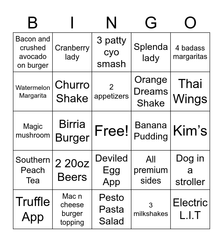This bingo card has a free space and 29 words: Truffle App, Elote Dip, Birria Burger, Cheese and bacon fry or tot, Bacon and crushed avocado on burger, 3 patty cyo smash, Churro Shake, 2 20oz Beers, Banana Pudding, Mac n cheese burger topping, Kim’s, Electric L.I.T, Pesto Pasta Salad, 3 milkshakes, Thai Wings, Chunky Elvis Shake, Deviled Egg App, Southern Peach Tea, 4 badass margaritas, Magic mushroom, All premium sides, Stack n Smash, Orange Dreams Shake, Watermelon Margarita, Splenda lady, Cranberry lady, Dog in a stroller, 2 appetizers and Hot tea.