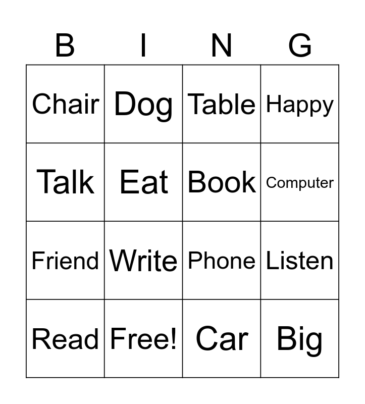 This bingo card has 21 words: Free!, Apple, Dog, House, Car, Book, Chair, Table, Phone, Computer, Friend, Happy, Big, Run, Eat, Sleep, Read, Write, Talk, Listen and Watch.