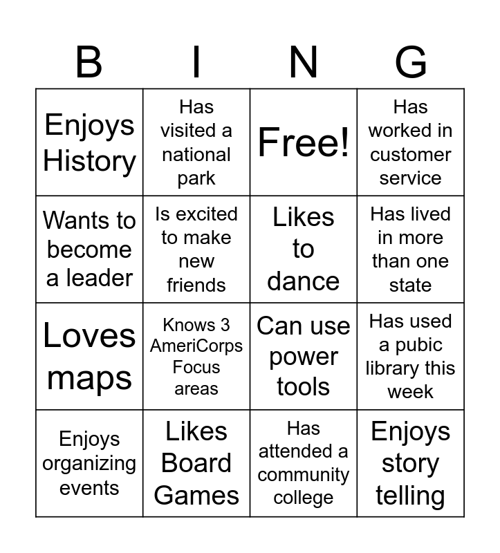 This bingo card has 21 words: Likes Board Games, Has used a compost bin, Has visited a national park, Can ride a bike, Has attended a community college, Likes to dance, Enjoys History, Free!, Can use power tools, Has lived in more than one state, Loves maps, Has worked in customer service, Enjoys story telling, Has led a group before, Is excited to make new friends, Can build a campfire, Enjoys organizing events, Knows 3 AmeriCorps Focus areas, Wants to become a leader, Has used a pubic library this week and Has painted a room before.