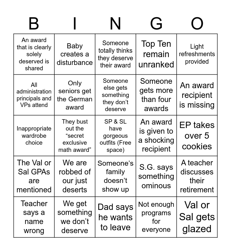 This bingo card has a free space and 24 words: We are robbed of our just deserts, We get something we don’t deserve, Someone else gets something they don’t deserve, Teacher says a name wrong, Light refreshments provided, An award that is clearly solely deserved is shared, All administration principals and VPs attend, Baby creates a disturbance, An award is given to a shocking recipient, Someone’s family doesn’t show up, Someone gets more than four awards, Inappropriate wardrobe choice, S.G. says something ominous, A teacher discusses their retirement, Only seniors get the German award, Not enough programs for everyone, EP takes over 5 cookies, Someone totally thinks they deserve their award, An award recipient is missing, They bust out the “secret exclusive math award”, Val or Sal gets glazed, The Val or Sal GPAs are mentioned, Top Ten remain unranked and Dad says he wants to leave.