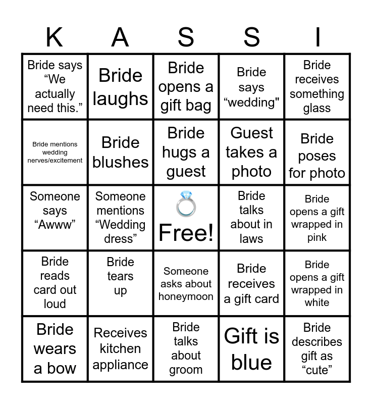 This bingo card has a free space and 24 words: Bride tears up, Receives kitchen appliance, Bride hugs a guest, Bride wears a bow, Bride receives something glass, Bride says “We actually need this.”, Bride mentions wedding nerves/excitement, Bride laughs, Bride talks about in laws, Someone asks about honeymoon, Guest takes a photo, Someone says “Awww”, Bride receives a gift card, Bride opens a gift wrapped in white, Bride blushes, Gift is blue, Bride opens a gift wrapped in pink, Bride opens a gift bag, Bride poses for photo, Someone mentions “Wedding dress”, Bride describes gift as “cute”, Bride reads card out loud, Bride says “wedding" and Bride talks about groom.