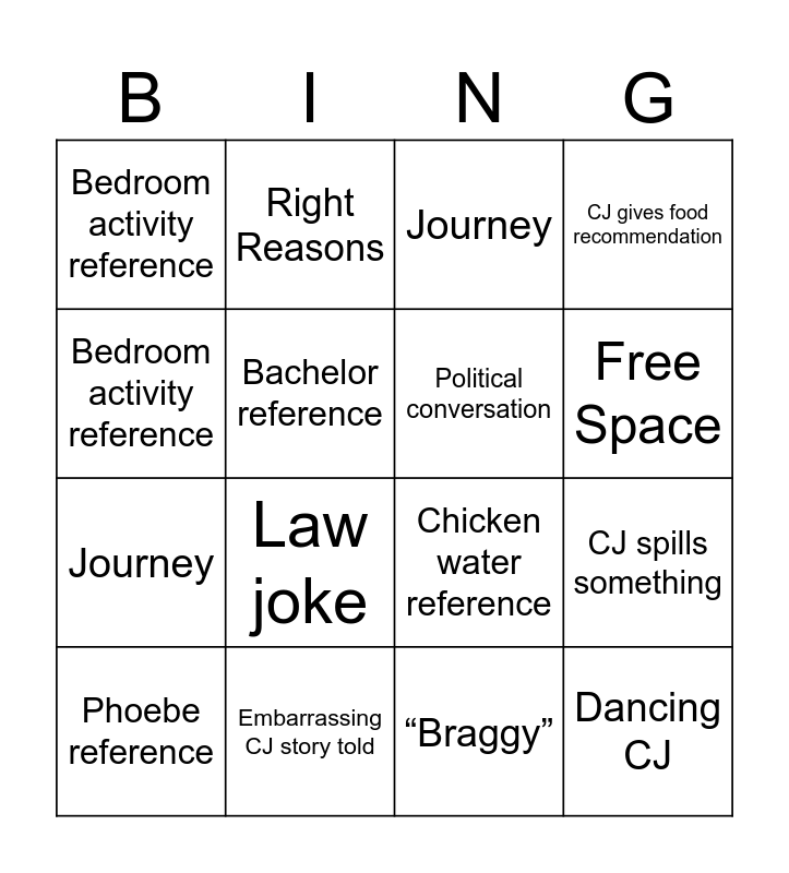 ⚠ This card has duplicate items: Chicken water reference (2), CJ spills something (2), CJ is late (2), Dancing CJ (2), Political conversation (2), Bedroom activity reference (2), “Braggy” (2), Right Reasons (2), Phoebe reference (2), Journey (2), Bachelor reference (2), CJ cries (2), Embarrassing CJ story told (2), Law joke (2), Tequila Shot (2)