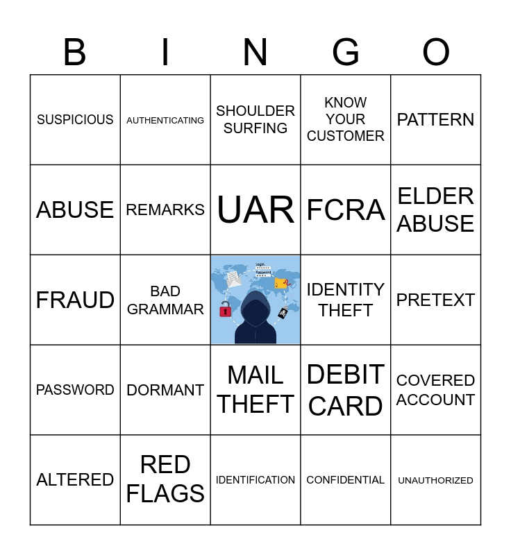 This bingo card has a free space and 24 words: DORMANT, RED FLAGS, UAR, ALTERED, PATTERN, SUSPICIOUS, ABUSE, AUTHENTICATING, IDENTITY THEFT, MAIL THEFT, FCRA, FRAUD, DEBIT CARD, COVERED ACCOUNT, REMARKS, CONFIDENTIAL, PRETEXT, SHOULDER SURFING, ELDER ABUSE, BAD GRAMMAR, UNAUTHORIZED, PASSWORD, KNOW YOUR CUSTOMER and IDENTIFICATION.