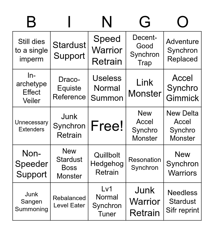 This bingo card has a free space and 24 words: New Stardust Boss Monster, Rebalanced Level Eater, Useless Normal Summon, Junk Sangen Summoning, Adventure Synchron Replaced, Still dies to a single imperm, In-archetype Effect Veiler, Stardust Support, New Accel Synchro Monster, Quillbolt Hedgehog Retrain, Link Monster, Unnecessary Extenders, Resonation Synchron, New Synchron Warriors, Draco-Equiste Reference, Junk Warrior Retrain, New Delta Accel Synchro Monster, Speed Warrior Retrain, Accel Synchro Gimmick, Junk Synchron Retrain, Needless Stardust Sifr reprint, Non-Speeder Support, Decent-Good Synchron Trap and Lv1 Normal Synchron Tuner.