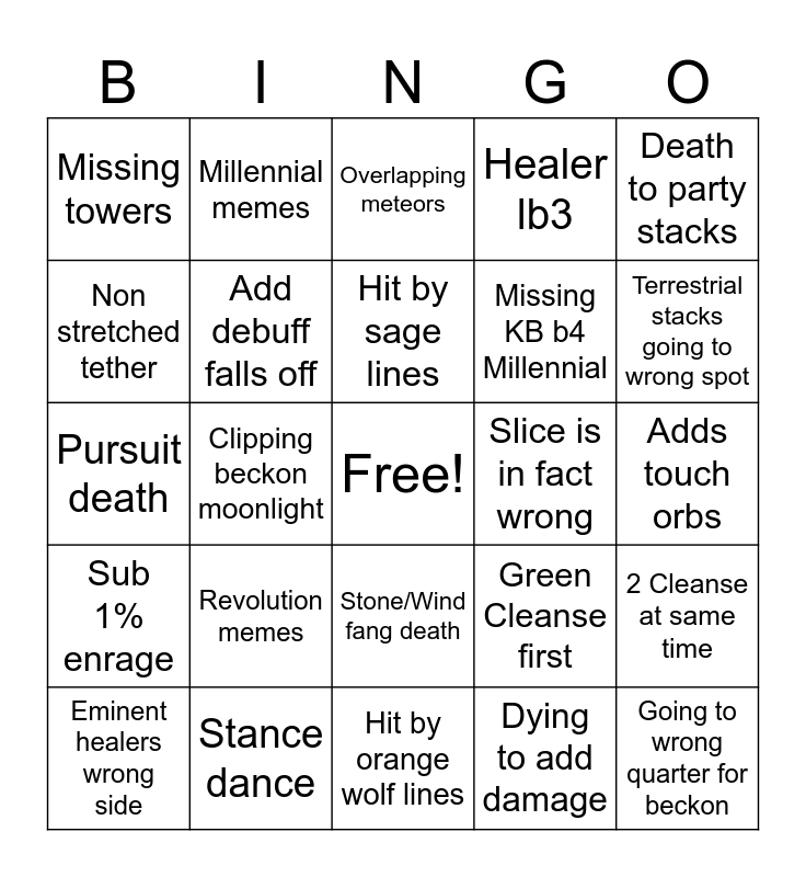 This bingo card has a free space and 24 words: Revolution memes, Stance dance, Hit by sage lines, Eminent healers wrong side, Death to party stacks, Missing towers, Non stretched tether, Millennial memes, Slice is in fact wrong, Stone/Wind fang death, Missing KB b4 Millennial, Pursuit death, Green Cleanse first, 2 Cleanse at same time, Add debuff falls off, Dying to add damage, Adds touch orbs, Overlapping meteors, Terrestrial stacks going to wrong spot, Clipping beckon moonlight, Going to wrong quarter for beckon, Sub 1% enrage, Healer lb3 and Hit by orange wolf lines.