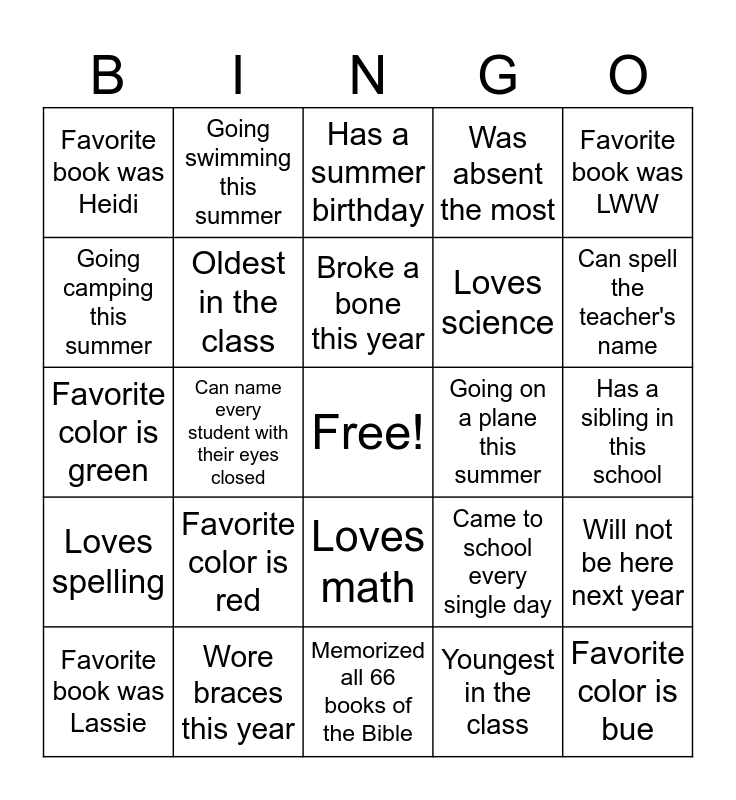 This bingo card has a free space and 24 words: Favorite color is red, Wore braces this year, Broke a bone this year, Favorite book was Lassie, Favorite book was LWW, Favorite book was Heidi, Going camping this summer, Going swimming this summer, Going on a plane this summer, Loves math, Loves science, Favorite color is green, Came to school every single day, Will not be here next year, Oldest in the class, Youngest in the class, Has a sibling in this school, Has a summer birthday, Can spell the teacher's name, Can name every student with their eyes closed, Favorite color is bue, Loves spelling, Was absent the most and Memorized all 66 books of the Bible.