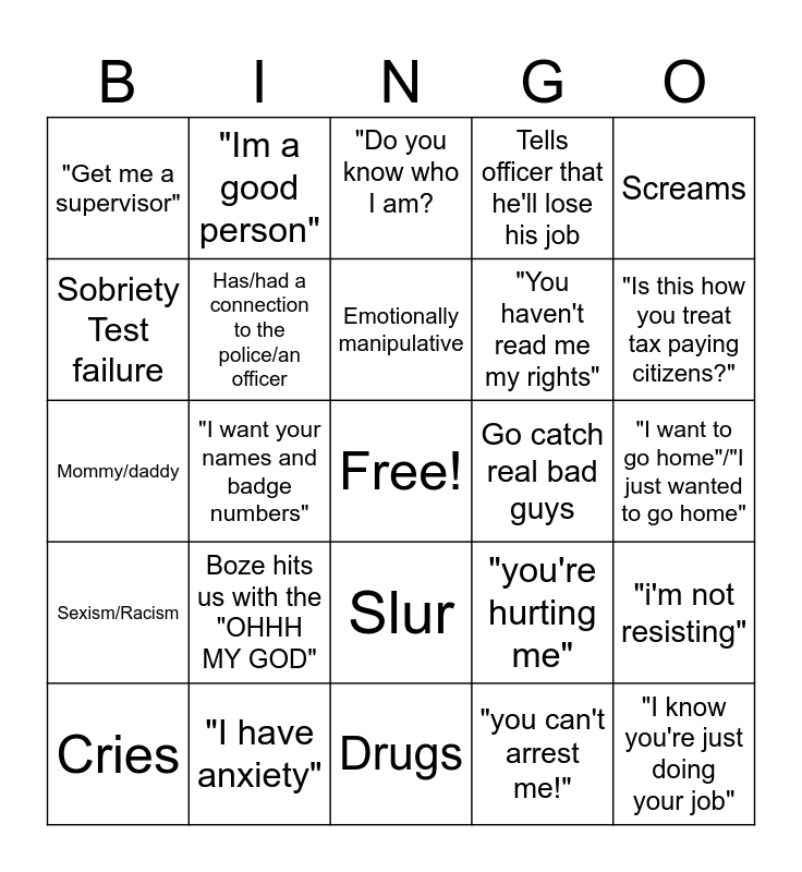 This bingo card has a free space and 35 words: "do you know how much I make?"/ "I have more $ than you", "What did I do?" after being told multiple times, Drunk, Has/had a connection to the police/an officer, Slur, Tells officer that he'll lose his job, Sobriety Test failure, Call my lawyer, Emotionally manipulative, "I didn't do anything", Mommy/daddy, Screams, Bites/kicks, "But my kidssss", "Get me a supervisor", Go catch real bad guys, "you can't arrest me!", "I want your names and badge numbers", Sexism/Racism, "I know you're just doing your job", "you're hurting me", Cries, "i'm not resisting", "I have anxiety", "Do you know who I am?, "Is this how you treat tax paying citizens?", Spit Guard/The wrap, Handcuffs are too "tight", "You haven't read me my rights", "I want to go home"/"I just wanted to go home", Sexually harassing the officer, Drugs, Boze hits us with the "OHHH MY GOD", "Im a good person" and "I need to pee".