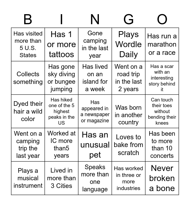 This bingo card has 25 words: Worked at IC more than5 years, Speaks more than one language, Has lived on an island for a week, Plays a musical instrument, Has run a marathon or a race, Has visited more than 5 U.S. States, Collects something, Has 1 or more tattoos, Was born in another country, Has an unusual pet, Went on a road trip in the last 2 years, Dyed their hair a wild color, Loves to bake from scratch, Has been to more than 10 concerts, Has gone sky diving or bungee jumping, Never broken a bone, Can touch their toes without bending their knees, Gone camping in the last year, Has a scar with an interesting story behind it, Has hiked one of the 5 highest peaks in the US, Has appeared in a newspaper or magazine, Lived in more than 3 Cities, Went on a camping trip the last year, Plays Wordle Daily and Has worked in three or more industries.