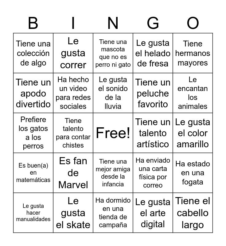 This bingo card has a free space and 101 words: Tiene 2 perros, Su color favorito es el morado, Tiene hermanos mayores, Ha viajado fuera del país, Le encanta cantar, Sabe tocar guitarra, Es fan de los videojuegos, Le gusta el anime, Prefiere el frío al calor, Ama el chocolate, Tiene un gato, Le gusta el fútbol, Es zurdo(a), Ha ido a un campamento de la Iglesia, Le gusta dibujar, Prefiere la playa a la montaña, Es buen(a) en matemáticas, Le gusta la historia, Tiene una bicicleta, Toca un instrumento musical, Le gusta bailar, Le gusta cocinar, Tiene el cabello rizado, Usa lentes, Le gusta escribir historias, Le encantan los animales, Le gusta el helado de fresa, Es fan de Marvel, Su color favorito es el verde, Ha participado en una obra de teatro, Le gusta correr, Tiene una mascota que no es perro ni gato, Es tímido(a) al principio, Tiene una voz fuerte, Ha ayudado en una actividad de servicio, Tiene una mejor amiga desde la infancia, Le gusta escuchar música cristiana, Le gusta resolver rompecabezas, Le gusta el arte digital, Ha dormido en una tienda de campaña, Le gusta leer novelas de aventura, Le gusta hacer manualidades, Le gusta la pizza, Le gusta ver películas románticas, Le gusta la fotografía, Tiene el cabello largo, Le gustan las matemáticas, Ha hecho una presentación en público, Asiste a seminario, Prefiere los días nublados, Le gusta pintar con acuarelas, Tiene un apodo divertido, Nació en otro país, Tiene más de 3 hermanos, Le gusta andar en patineta, Tiene una planta como mascota, Le gusta la música clásica, Tiene pecas, Le gustan las películas de acción, Le gusta ver documentales, Ha hecho un video para redes sociales, Tiene su cuarto decorado con luces, Le gustan los acertijos, Le gusta jugar Uno, Prefiere estar descalzo(a) en casa, Tiene un peluche favorito, Su color favorito es el azul, Tiene talento para contar chistes, Le gusta el skate, Ha escrito un diario, Sabe hacer trenzas, Le gustan los animales marinos, Tiene una colección de algo, Ha hecho un ayuno completo, Le gusta el sonido de la lluvia, Prefiere los gatos a los perros, Ha memorizado un versículo de las Escrituras, Ha participado en una actividad de talentos, Sabe tocar piano, Tiene una voz dulce, Le gusta armar legos, Se duerme temprano, Tiene un talento artístico, Le gusta escribir cartas, Sabe hacer origami, Le gusta crear historias, Le gusta el color amarillo, Sabe montar a caballo, Le gusta ver el atardecer, Le gusta la ciencia, Ha enviado una carta física por correo, Ha estado en una caminata de más de 5 km, Tiene una mascota con un nombre original, Ha participado en una gincana, Le gustan los juegos de mesa, Ha estado en una fogata, Le gusta aprender idiomas, Se sabe un himno completo, Le gusta tomar fotos de la naturaleza, Tiene su cuarto muy ordenado and Le gustan los desafíos.