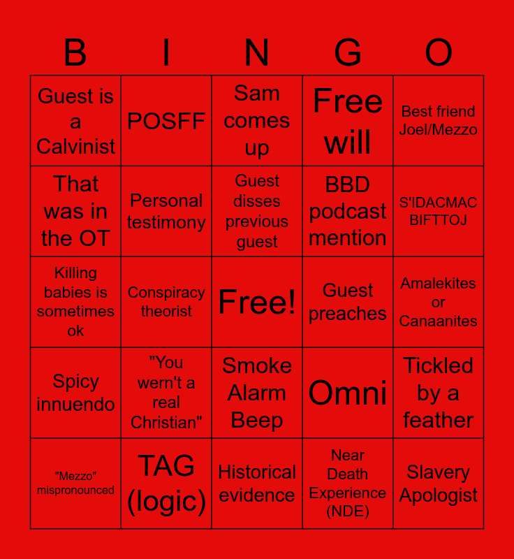 This bingo card has a free space and 29 words: "Mezzo" mispronounced, Guest wants to pray, Conspiracy theorist, Objective morality, Guest is a Calvinist, Sam comes up, Personal testimony, "You wern't a real Christian", Guest preaches, TAG (logic), Amalekites or Canaanites, Slavery Apologist, Historical evidence, Near Death Experience (NDE), S'IDACMAC BIFTTOJ, Eli comes up, Smoke Alarm Beep, Spicy innuendo, Best friend Joel/Mezzo, Killing babies is sometimes ok, Omni, Guest gets muted, BBD podcast mention, That was in the OT, Free will, POSFF, Tickled by a feather, Guest disses previous guest and Guest crashes out.