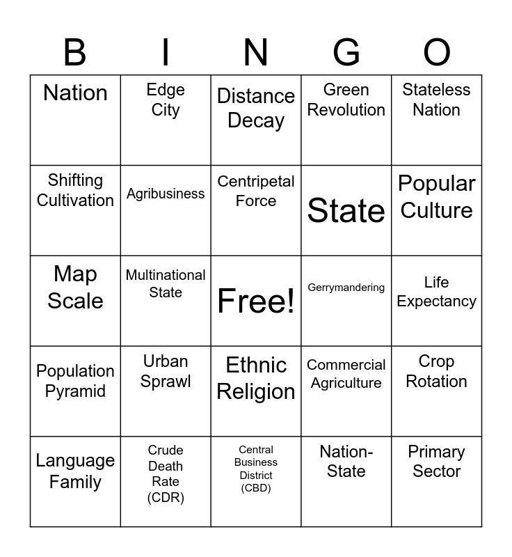 This bingo card has a free space and 48 words: Gross Domestic Product (GDP), Primary Sector, Megacity, Central Business District (CBD), Urban Sprawl, Gentrification, Edge City, Urbanization, Shifting Cultivation, Intensive Farming, Agribusiness, Green Revolution, Crop Rotation, Commercial Agriculture, Subsistence Agriculture, Centrifugal Force, Centripetal Force, Gerrymandering, Sovereignty, Stateless Nation, Multinational State, Nation-State, Nation, State, Folk Culture, Popular Culture, Language Family, Universalizing Religion, Ethnic Religion, Population Pyramid, Forced Migration, Voluntary Migration, Culture, Cultural Diffusion, Crude Death Rate (CDR), Total Fertility Rate (TFR), Natural Increase Rate (NIR), Life Expectancy, Demographic Transition Model (DTM), GIS, GPS, Spatial Analysis, Distance Decay, Crude Birth Rate (CBR), Map Scale, Projection, Relative Location and Syncretism.