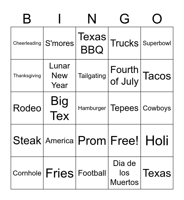 This bingo card has 25 words: America, Football, Tailgating, Cornhole, Superbowl, Cheerleading, Thanksgiving, S'mores, Tepees, Prom, Fourth of July, Rodeo, Free!, Holi, Lunar New Year, Texas, Cowboys, Texas BBQ, Tacos, Big Tex, Hamburger, Fries, Steak, Trucks and Dia de los Muertos.