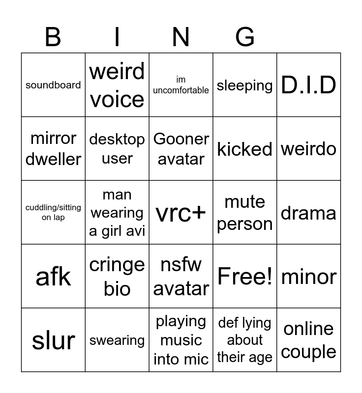 This bingo card has 25 words: cringe bio, playing music into mic, Gooner avatar, slur, D.I.D, soundboard, mirror dweller, weird voice, mute person, nsfw avatar, kicked, cuddling/sitting on lap, Free!, minor, desktop user, online couple, drama, im uncomfortable, weirdo, man wearing a girl avi, vrc+, swearing, afk, sleeping and def lying about their age.