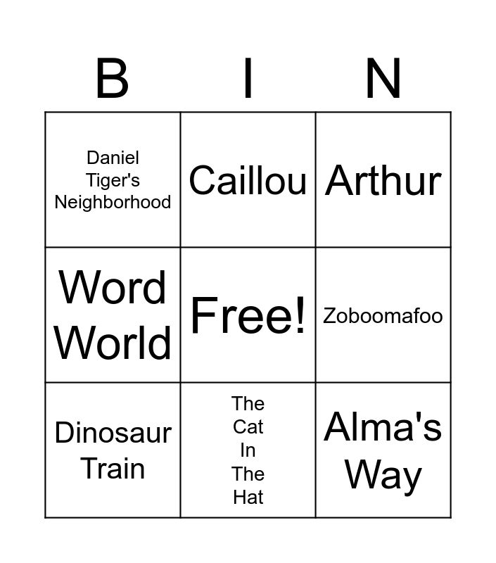 This bingo card has a free space and 27 words: Sesame Street, Zoom, Portuguese (aka) Powerhouse, Alphabet Roundup (aka) Square One, Zoboomafoo, Arthur, Caillou, The Magic School Bus, Zula, Teletubbies, Super Why, Word World, Word Girl, Molly Of Denali, Martha Speaks, Sid The Science Kid, Dinosaur Train, The Cat In The Hat, Wild Kratts, Daniel Tiger's Neighborhood, Peg Plus Cat, Splash And Bubbles, Let's Go Luna, Pinkalicious And Peterrific, Xavier Riddle And The Secret Museum, Alma's Way and Donkey Hodie.