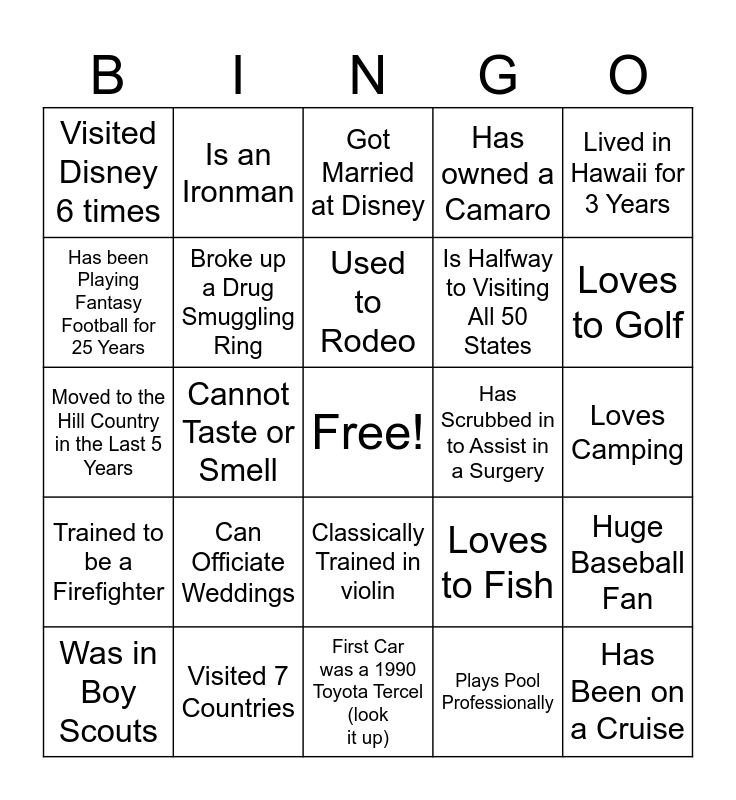 This bingo card has a free space and 24 words: Can Officiate Weddings, Visited 7 Countries, Used to Rodeo, Was in Boy Scouts, Lived in Hawaii for 3 Years, Visited Disney 6 times, Has been Playing Fantasy Football for 25 Years, Is an Ironman, Has Scrubbed in to Assist in a Surgery, Classically Trained in violin, Is Halfway to Visiting All 50 States, Moved to the Hill Country in the Last 5 Years, Loves to Fish, Huge Baseball Fan, Broke up a Drug Smuggling Ring, Plays Pool Professionally, Loves Camping, Got Married at Disney, Loves to Golf, Cannot Taste or Smell, Has Been on a Cruise, Trained to be a Firefighter, Has owned a Camaro and First Car was a 1990 Toyota Tercel (look it up).