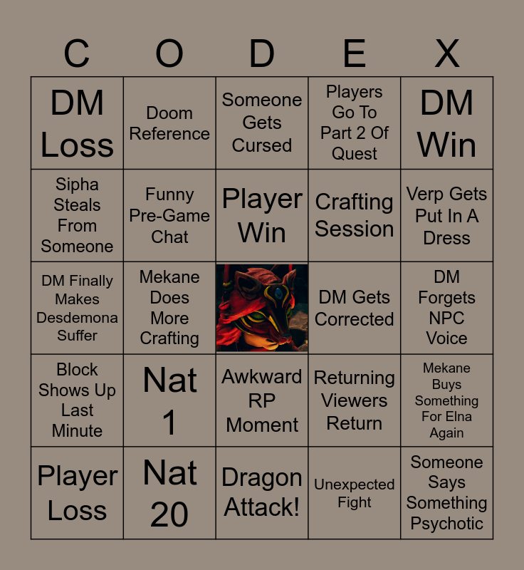 This bingo card has a free space and 24 words: Nat 1, Nat 20, Player Win, Player Loss, DM Win, DM Loss, Sipha Steals From Someone, Doom Reference, DM Gets Corrected, Awkward RP Moment, Crafting Session, DM Finally Makes Desdemona Suffer, Returning Viewers Return, Mekane Buys Something For Elna Again, Funny Pre-Game Chat, Unexpected Fight, DM Forgets NPC Voice, Someone Gets Cursed, Verp Gets Put In A Dress, Mekane Does More Crafting, Someone Says Something Psychotic, Block Shows Up Last Minute, Players Go To Part 2 Of Quest and Dragon Attack!.
