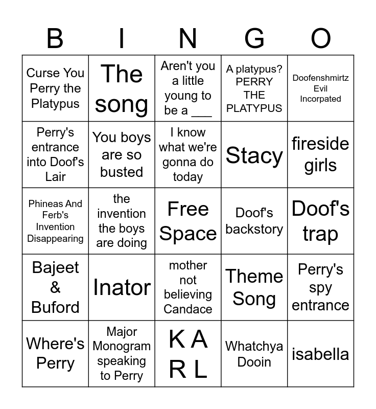 This bingo card has a free space and 24 words: Where's Perry, Inator, I know what we're gonna do today, Whatchya Dooin, Doofenshmirtz Evil Incorpated, Curse You Perry the Platypus, The song, Aren't you a little young to be a ___, Doof's backstory, Doof's trap, Phineas And Ferb's Invention Disappearing, You boys are so busted, Theme Song, Perry's spy entrance, Perry's entrance into Doof's Lair, Major Monogram speaking to Perry, K A R L, A platypus? PERRY THE PLATYPUS, fireside girls, Bajeet & Buford, the invention the boys are doing, mother not believing Candace, Stacy and isabella.