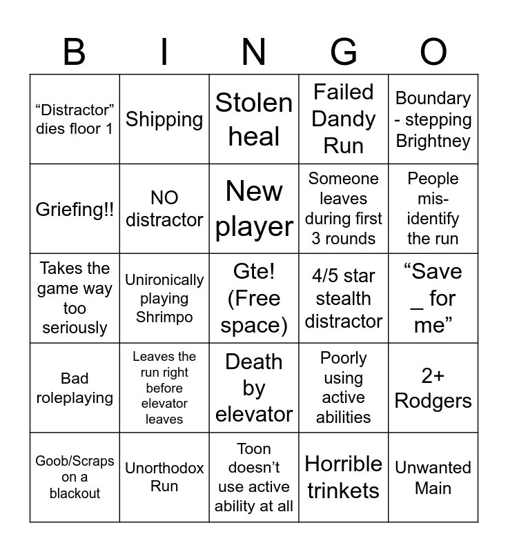 This bingo card has a free space and 36 words: Overly Apologetic, Threats against Dandy, Extractor Pebble, NO distractor, Poorly using active abilities, Bad roleplaying, New player, Freaky…, Boundary - stepping Brightney, Toodles causing problems, Unironically playing Shrimpo, Failed Dandy Run, “EAE” before everyone’s there, 4/5 star stealth distractor, People mis-identify the run, “Distractor” dies floor 1, So many Hashtags, Leaves the run right before elevator leaves, Unwanted Main, Stolen heal, “Save _ for me”, 2+ Rodgers, Unorthodox Run, Goob/Scraps on a blackout, Toon doesn’t use active ability at all, Shipping, Takes the game way too seriously, First to die is a main, Someone leaves during first 3 rounds, Griefing!!, Pestering People doing machines, Duplicate Toons (must be same skin), Horrible trinkets, Death by elevator, Run owner abandons run and 5+ Mains.