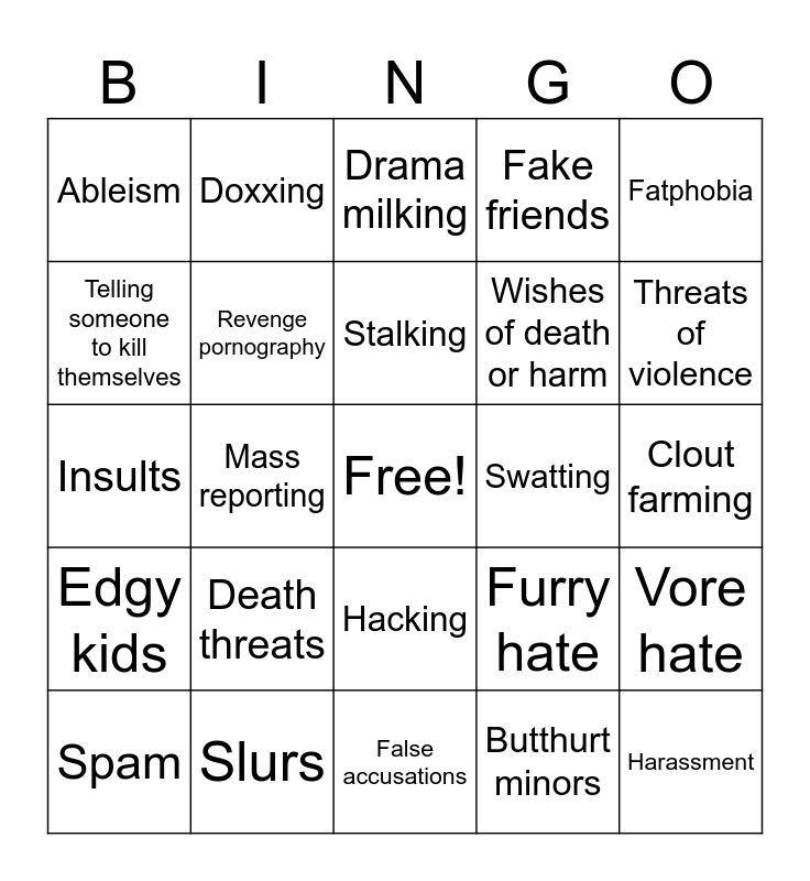 This bingo card has a free space and 24 words: Death threats, Slurs, Stalking, Spam, Fatphobia, Ableism, Telling someone to kill themselves, Doxxing, Swatting, Hacking, Wishes of death or harm, Insults, Furry hate, Vore hate, Revenge pornography, Butthurt minors, Clout farming, Drama milking, Threats of violence, Mass reporting, Harassment, Edgy kids, Fake friends and False accusations.