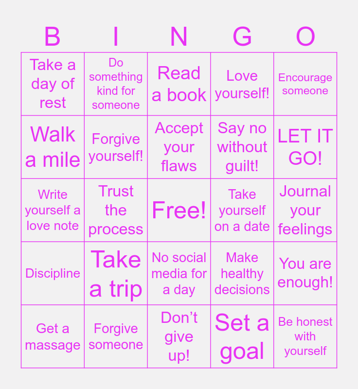 This bingo card has a free space and 24 words: Take a trip, Forgive someone, Accept your flaws, Get a massage, Encourage someone, Take a day of rest, Walk a mile, Do something kind for someone, Take yourself on a date, No social media for a day, Say no without guilt!, Write yourself a love note, Make healthy decisions, You are enough!, Forgive yourself!, Set a goal, Journal your feelings, Read a book, LET IT GO!, Trust the process, Be honest with yourself, Discipline, Love yourself! and Don’t give up!.