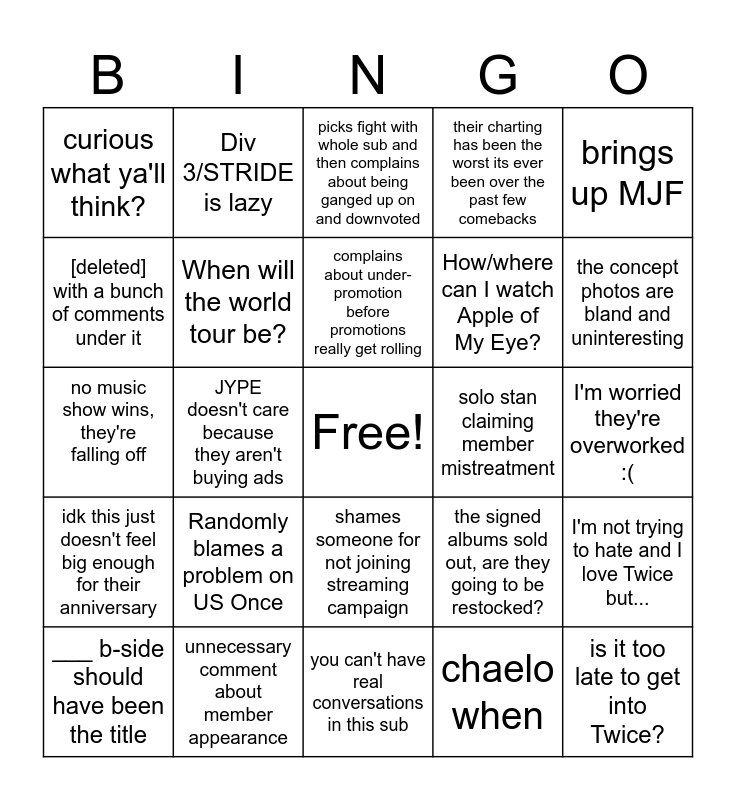 This bingo card has a free space and 24 words: Randomly blames a problem on US Once, unnecessary comment about member appearance, complains about under-promotion before promotions really get rolling, ___ b-side should have been the title, brings up MJF, curious what ya'll think?, [deleted] with a bunch of comments under it, Div 3/STRIDE is lazy, solo stan claiming member mistreatment, shames someone for not joining streaming campaign, How/where can I watch Apple of My Eye?, no music show wins, they're falling off, the signed albums sold out, are they going to be restocked?, I'm not trying to hate and I love Twice but..., When will the world tour be?, chaelo when, I'm worried they're overworked :(, picks fight with whole sub and then complains about being ganged up on and downvoted, the concept photos are bland and uninteresting, JYPE doesn't care because they aren't buying ads, is it too late to get into Twice?, idk this just doesn't feel big enough for their anniversary, their charting has been the worst its ever been over the past few comebacks and you can't have real conversations in this sub.