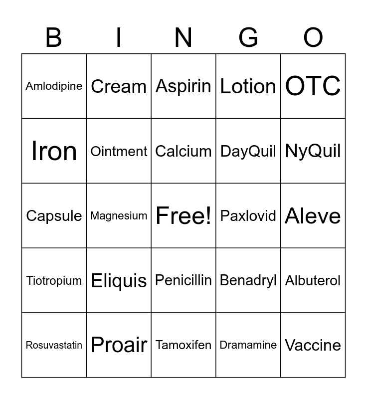This bingo card has a free space and 75 words: Acetaminophen, Tylenol, Aspirin, Advil, Motrin, Ibuprofen, Vitamin A, Vitamin B, Vitamin C, Vitamin D, Vitamin E, Vitamin K, Calcium, Iron, Potassium, Magnesium, Insulin, Vaccine, Prescription, OTC, Tablet, Capsule, Ointment, Cream, Lotion, Probiotic, Pepcid, Pill, Laxative, Theraflu, Zyrtec, Claritin, Allegra, Benadryl, NyQuil, DayQuil, Mucinex, Melatonin, Aleve, Dramamine, Pesto bismol, Tums, Miralax, Dulcolax, Senna S, Lisinopril, Rosuvastatin, Amlodipine, Metformin, Ondansetron, Amoxicillin, Penicillin, Levothyroxine, Epi pen, Macrobid, Bactrim, Augmentin, Colchicine, Fish oil, Warfarin, Eliquis, Timolol, Torsemide, Faraxiga, Nitrostat, Paxlovid, Fluconazole, Bimatoprost, Losartan, Albuterol, Tiotropium, Proair, Rifampin, Tamoxifen and Triamcinolone.