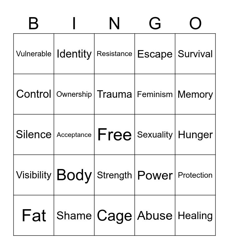 This bingo card has a free space and 24 words: Body, Shame, Trauma, Fat, Survival, Vulnerable, Control, Identity, Sexuality, Strength, Feminism, Silence, Power, Protection, Ownership, Abuse, Hunger, Resistance, Memory, Acceptance, Healing, Visibility, Escape and Cage.