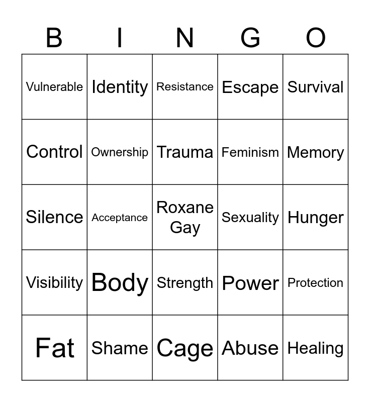 This bingo card has a free space and 24 words: Body, Shame, Trauma, Fat, Survival, Vulnerable, Control, Identity, Sexuality, Strength, Feminism, Silence, Power, Protection, Ownership, Abuse, Hunger, Resistance, Memory, Acceptance, Healing, Visibility, Escape and Cage.