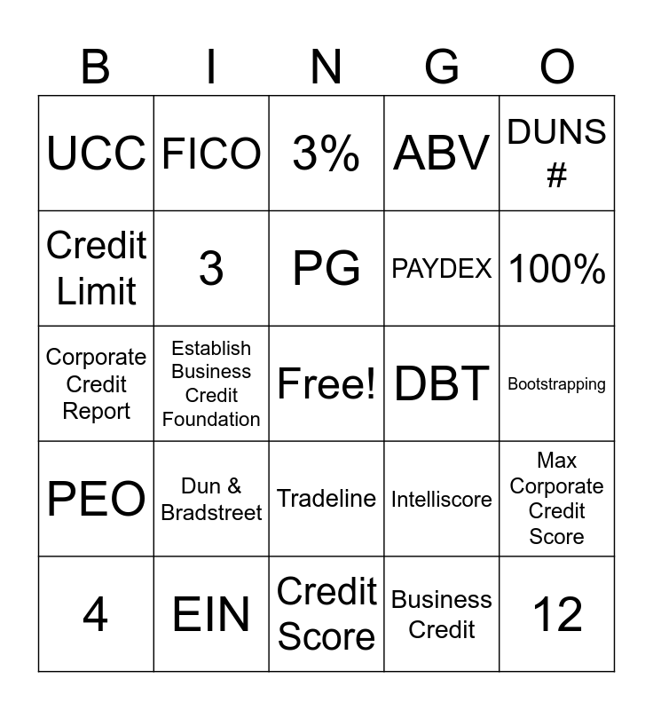 This bingo card has a free space and 24 words: Dun & Bradstreet, EIN, PG, 4, DUNS #, UCC, Credit Limit, FICO, DBT, Tradeline, PAYDEX, Corporate Credit Report, Intelliscore, Max Corporate Credit Score, 3, Business Credit, Bootstrapping, 3%, 100%, Establish Business Credit Foundation, 12, PEO, ABV and Credit Score.