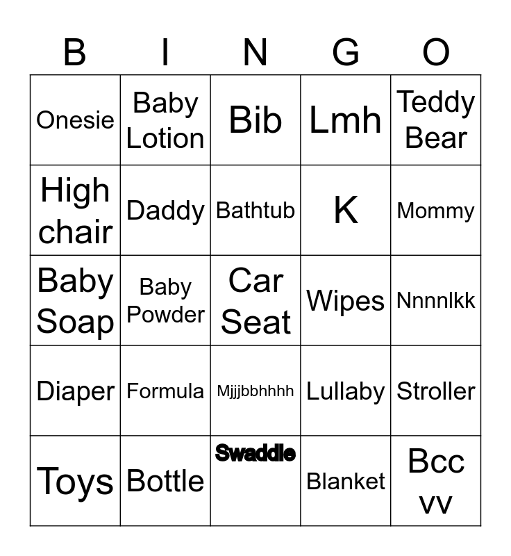 This bingo card has 25 words: Diaper, Bottle, Car Seat, Blanket, Teddy Bear, Onesie, Baby Lotion, Bib, Wipes, Stroller, High chair, Daddy, Swaddle, Lullaby, Mommy, Toys, Baby Powder, Bathtub, K, Nnnnlkk, Baby Soap, Formula, Mjjjbbhhhh, Lmh and Bcc vv.