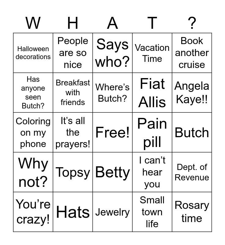 This bingo card has a free space and 74 words: Well sh$t, I’m hungry, Says who?, Cruise, Nearest Casino?, I have the Best Grandkids, Father Jim Blessed me!, Father Jim Blessed me, again!, You’re crazy!, I’m cold, It’s freezing in here, Fix my phone, Where’s Butch?, Has anyone seen Butch?, I don’t want to, It’s all the prayers!, Butch!, Angela Kaye!!, Cindy!!!, Coloring on my phone, Breakfast with friends, People are so nice, Vacation Time, Reading, Rosary time, Praying, Coffee Clutch friends, 1st Friday Mass, What time is Confession?, Canoe Trip, Book another cruise, Mass, I love my grandbabies, Athens, Born on the kitchen table, Small town life, I love cruising, My head itches, Pink, Purple, Jewelry, Hats, I need to clean my house, Christmas decorations, Easter decorations, Halloween decorations, Let Butch do it, Topsy, Newt, Sis, Linda, Valentine’s decorations, Butch, Herb, I love Father Jim!, Father Jim is so sweet!, Betty, Nanster, Pinky, Dept. of Revenue, Fiat Allis, There’s Father Jim!, Why not?, Sleepover with grandkids, Pain pill, It’s a Miracle!, I need a beer, Shopping, I can’t hear you, I forgot my hearing aids, I hate these hearing aids, Living on a Prayer, You can’t make me and Why??.