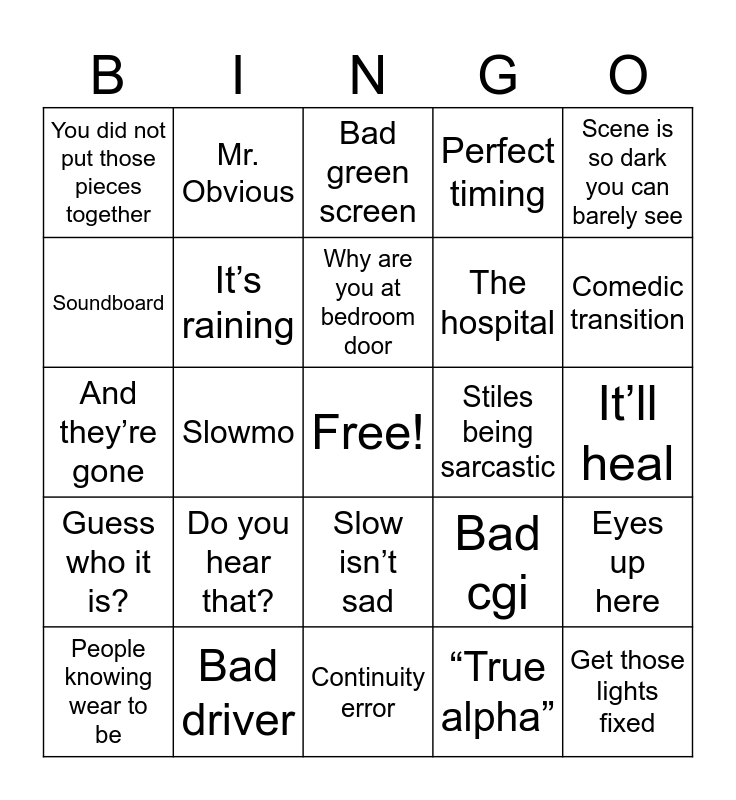 This bingo card has a free space and 56 words: Stiles, People knowing wear to be, Lying or doing things for no reason, You did not put those pieces together, Continuity error, People switching up to fast, It’s raining, Being vague, The hospital, Mom breaking hospital laws, Perfect timing, Scott stare, Duuuuu * commercial*, School at night, school having no security, Music is played too loud, Scene is so dark you can barely see, Slowmo, Your not spider man, Get those lights fixed, Stiles being sarcastic, Just add water “plans”, Bad cgi, Bad green screen, Acting like no one can hear you, Why are you at bedroom door, Breaking laws, Curious killed the cat, Comedic transition, Cheesy lines, Creepy instead of scary, What are you on about?, Get to it, Werewolf’s not being werewolf’s, It’ll heal, Soundboard, And they’re gone, Unnecessary backflip, Guess who it is?, Mr. Obvious, Slow isn’t sad, Your not all that, Queer baiting, What is this music?, Product placement, Do you hear that?, Bad driver, Bad phone call skills, What is that outfit, Spoiler captions, “True alpha”, Bad acting, Fast and Furious, Confusing powers, Eyes up here and Good guess.