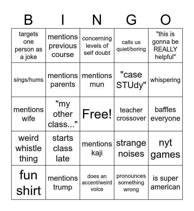 This bingo card has a free space and 40 words: mentions russia trip, mentions wife, mentions kids, mentions parents, mentions trump, mentions kaji, mentions mun, mentions chatgpt, "this is gonna be REALLY helpful", weird whistle thing, "my other class...", calls us quiet/boring, is super american, baffles everyone, teacher crossover, starts class late, "you guys will be fine", targets one person as a joke, no laptops allowed, concerning levels of self doubt, nyt games, pronounces something wrong, "case STUdy", sings/hums, has a cough or sore throat, speaks another language, joins a convo about something unrelated, comments on how unbalanced the tables are, sets a weird amount of time for a task, sets a strange task (e.g. podcast, group drawing), refers to someone by full name/surname, fun shirt, refuses to use an acronym, strange noises, whispering, does an accent/weird voice, tea, talks to no one in particular, mentions previous course and mentions ep.