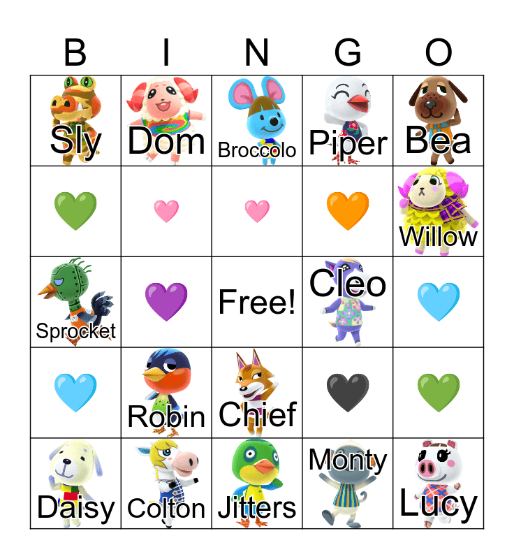 This bingo card has 24 images, a free space and 43 words: Olivia, Lucy, Blanche, Daisy, Molly, Monty, Broccolo, Cesar, Bea, Colton, Piper, Cleo, Chief, Robin, Mitzi, Jitters, Erik, Sprocket, Peewee, Willow, Dom, Alice, Groucho, Sly, โค๏ธ, ๐ฉต, ๐ค, ๐, ๐ค, ๐ฉต, ๐, ๐, ๐, ๐, ๐, ๐, โค๏ธ, ๐ฉท, ๐, ๐งก, โค๏ธ, ๐ฉท and ๐ค.