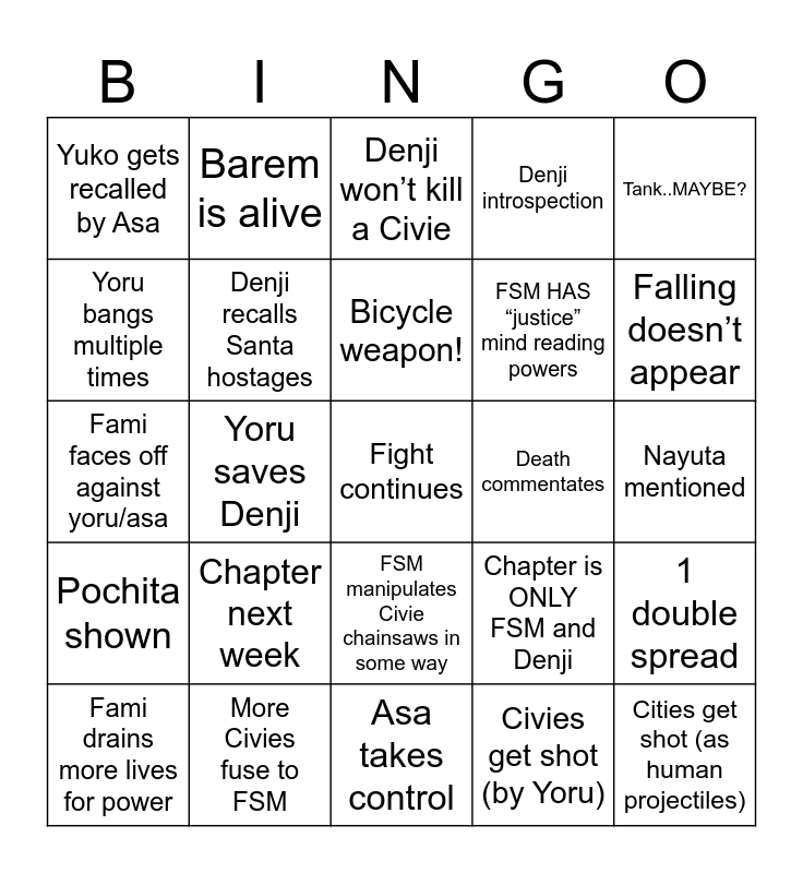 This bingo card has a free space and 24 words: Chapter next week, More Civies fuse to FSM, Bicycle weapon!, Fami drains more lives for power, Tank..MAYBE?, Yuko gets recalled by Asa, Yoru bangs multiple times, Barem is alive, Death commentates, FSM manipulates Civie chainsaws in some way, FSM HAS “justice” mind reading powers, Fami faces off against yoru/asa, Chapter is ONLY FSM and Denji, 1 double spread, Denji recalls Santa hostages, Civies get shot (by Yoru), Nayuta mentioned, Denji won’t kill a Civie, Falling doesn’t appear, Yoru saves Denji, Cities get shot (as human projectiles), Pochita shown, Denji introspection and Asa takes control.