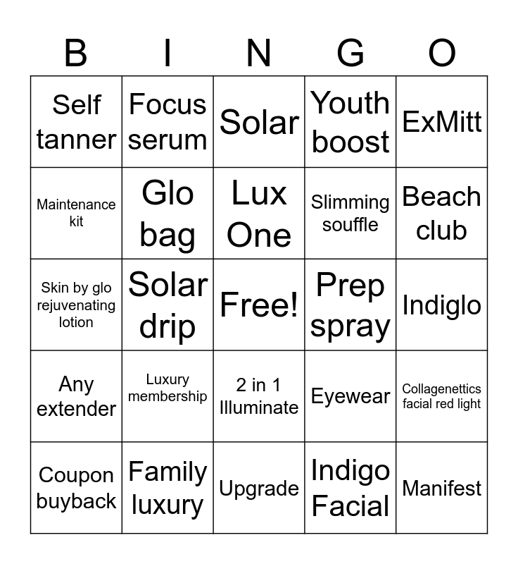 This bingo card has a free space and 24 words: Luxury membership, Family luxury, Lux One, Coupon buyback, ExMitt, Self tanner, Maintenance kit, Focus serum, Prep spray, 2 in 1 Illuminate, Slimming souffle, Skin by glo rejuvenating lotion, Eyewear, Collagenettics facial red light, Glo bag, Indigo Facial, Indiglo, Solar, Beach club, Solar drip, Manifest, Any extender, Youth boost and Upgrade.