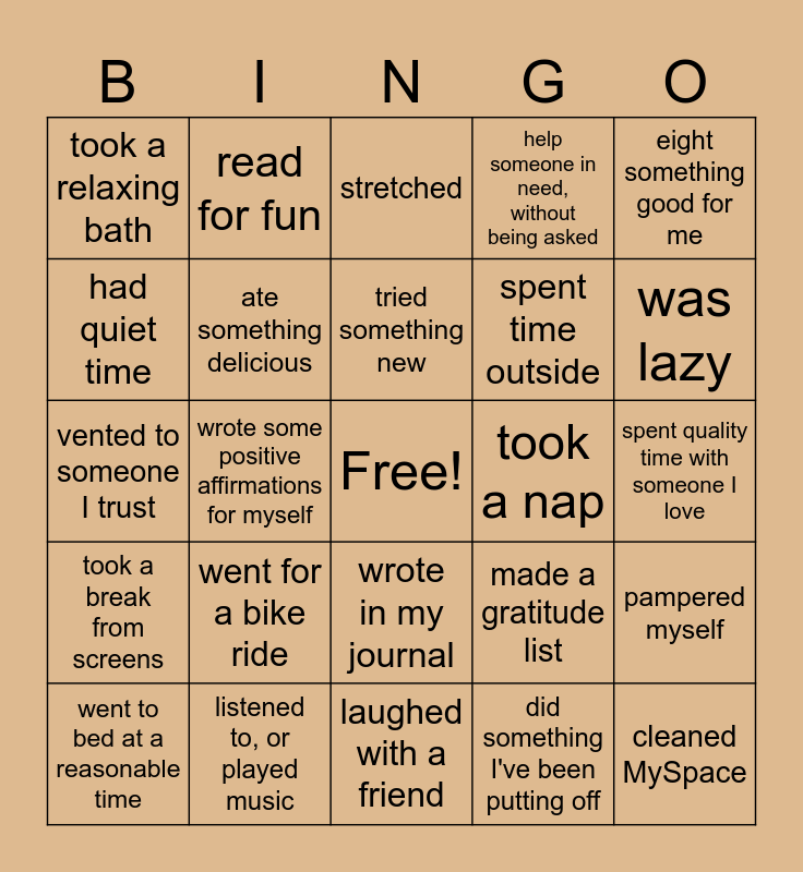 This bingo card has a free space and 24 words: went for a bike ride, listened to, or played music, tried something new, went to bed at a reasonable time, eight something good for me, took a relaxing bath, had quiet time, read for fun, took a nap, wrote in my journal, spent time outside, vented to someone I trust, made a gratitude list, pampered myself, ate something delicious, did something I've been putting off, spent quality time with someone I love, stretched, was lazy, wrote some positive affirmations for myself, cleaned MySpace, took a break from screens, help someone in need, without being asked and laughed with a friend.