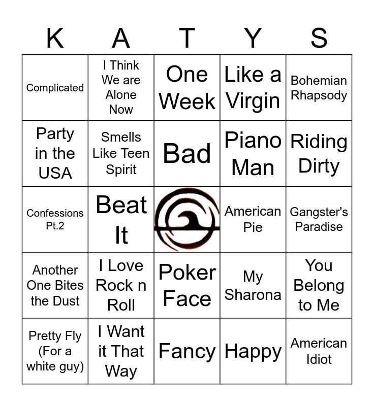 This bingo card has a free space and 30 words: I Want it That Way, What Ever You Like, Beat It, Blurred Lines, Complicated, One Week, Smells Like Teen Spirit, Poker Face, American Pie, Fancy, Gangster's Paradise, American Idiot, Happy, Mony Mony, Riding Dirty, Lose Yourself, My Sharona, Another One Bites the Dust, I Love Rock n Roll, Bohemian Rhapsody, Confessions Pt.2, Lola, I Think We are Alone Now, Piano Man, Party in the USA, Like a Virgin, You Belong to Me, Pretty Fly (For a white guy), Bad and Under the Bridge.