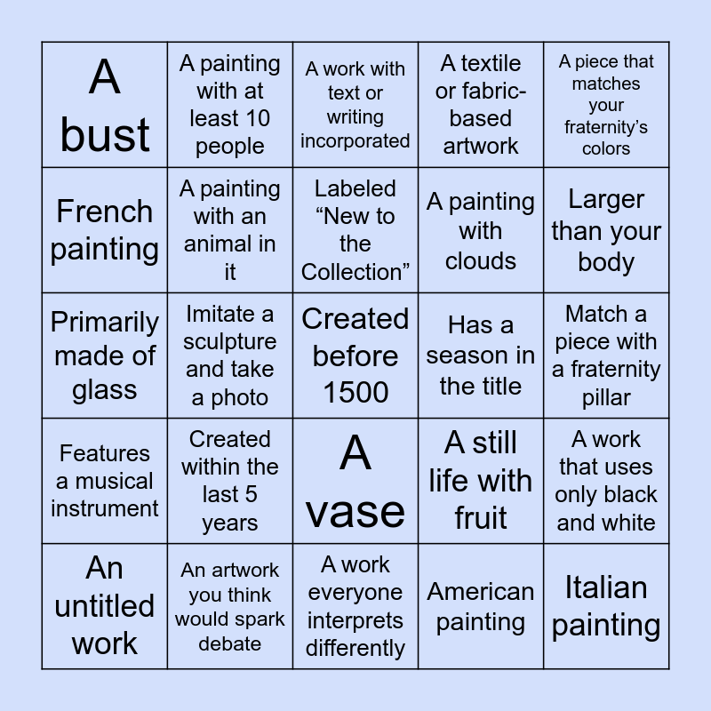 This bingo card has 25 words: Features a musical instrument, An artwork you think would spark debate, Created before 1500, American painting, A piece that matches your fraternity’s colors, A bust, A painting with at least 10 people, A work with text or writing incorporated, Has a season in the title, A work that uses only black and white, French painting, A painting with an animal in it, A work everyone interprets differently, A still life with fruit, Larger than your body, An untitled work, Imitate a sculpture and take a photo, Labeled “New to the Collection”, A painting with clouds, Match a piece with a fraternity pillar, Primarily made of glass, Created within the last 5 years, A vase, A textile or fabric-based artwork and Italian painting.