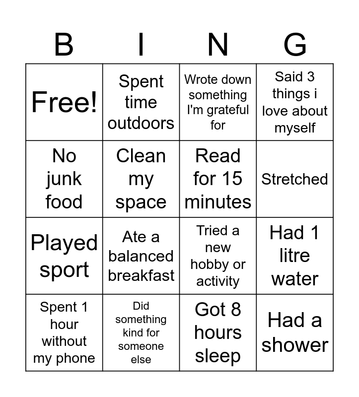 This bingo card has 16 words: Spent 1 hour without my phone, Did something kind for someone else, Wrote down something I'm grateful for, Said 3 things i love about myself, No junk food, Spent time outdoors, Tried a new hobby or activity, Had 1 litre water, Free!, Clean my space, Got 8 hours sleep, Stretched, Played sport, Ate a balanced breakfast, Read for 15 minutes and Had a shower.
