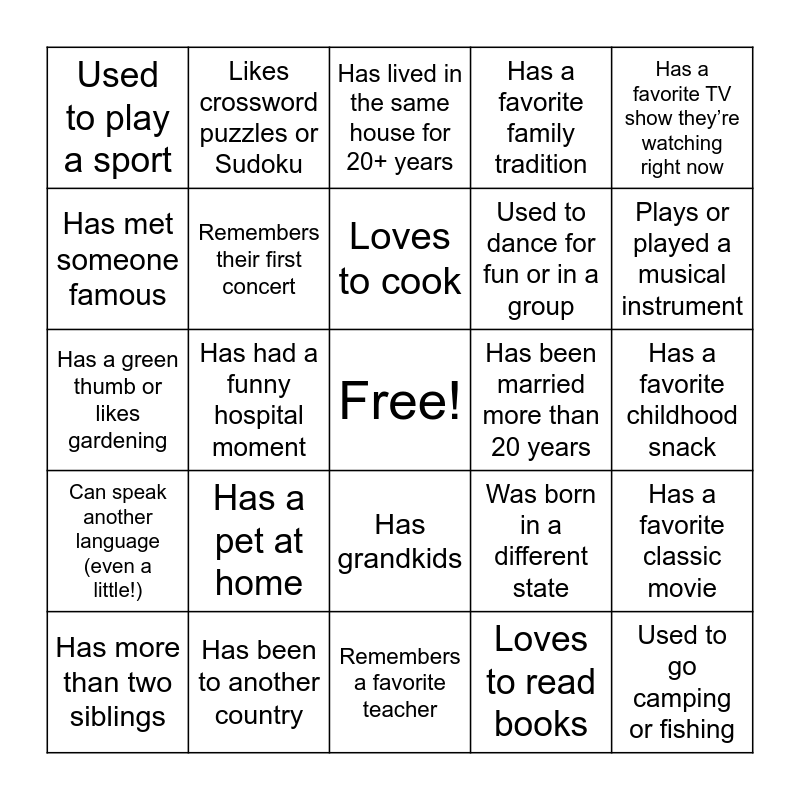 This bingo card has a free space and 24 words: Has a pet at home, Has been to another country, Loves to cook, Has more than two siblings, Has a favorite TV show they’re watching right now, Used to play a sport, Has met someone famous, Likes crossword puzzles or Sudoku, Has been married more than 20 years, Has grandkids, Used to dance for fun or in a group, Has a green thumb or likes gardening, Was born in a different state, Has a favorite classic movie, Remembers their first concert, Loves to read books, Has a favorite childhood snack, Has lived in the same house for 20+ years, Plays or played a musical instrument, Has had a funny hospital moment, Used to go camping or fishing, Can speak another language (even a little!), Has a favorite family tradition and Remembers a favorite teacher.