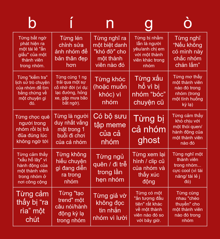This bingo card has 25 words: Từng không hiểu chuyện gì đang diễn ra trong nhóm, Từng giả vờ không đọc tin nhắn nhóm vì lười, Từng khóc (hoặc muốn khóc) vì nhóm, Từng cảm thấy bị “ra rìa” một chút, Từng nghĩ “Nếu không có mình này chắc nhóm chán lắm”, Từng bất ngờ phát hiện ra một tài lẻ "ẩn giấu" của một thành viên trong nhóm., Từng "kiểm tra" lịch sử trò chuyện của nhóm để tìm bằng chứng về một chuyện gì đó., Từng lén chỉnh sửa ảnh nhóm để bản thân đẹp hơn, Từng bị cả nhóm ghost, Từng ngủ quên / đi trễ trong lần hẹn nhóm, Từng xấu hổ vì bị nhóm “bóc” chuyện cũ, Từng chọc quê người trong nhóm rồi bị trả đũa đúng lúc không ngờ tới, Từng xem lại hình / clip cũ của nhóm và thấy xúc động, Từng nghĩ một thành viên trong nhóm... cực cool (vì tài năng/ tài lẻ j đó), Từng cùng 1 ng trải qua một sự cố nhớ đời (ví dụ: lạc đường, hỏng xe, gặp mưa bão bất ngờ)., Từng cùng nhau "chèo thuyền" cho một thành viên nào đó trong nhóm, Từng cảm thấy khó chịu với một thói quen/ hành động của một thành viên nào đó, Từng nghĩ ra một biệt danh "khó đỡ" cho một thành viên nào đó, Từng mơ thấy một thành viên nào đó trong nhóm (trong một tình huống kỳ lạ), Từng là người duy nhất vắng mặt trong 1 buổi đi chơi của cả nhóm, Có bộ sưu tập meme của cả nhóm, Từng "tạo trend" một câu nói/hành động kỳ lạ trong nhóm, Từng cảm thấy "xấu hổ lây" vì hành động của một thành viên trong nhóm ở nơi công cộng, Từng bị nhầm lẫn là người yêu/anh chị em với một thành viên khác trong nhóm and Từng có một "ấn tượng đầu tiên" rất khác về một thành viên nào đó so với bây giờ..