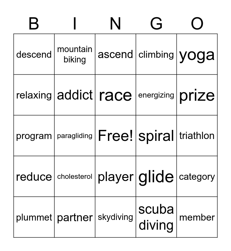This bingo card has a free space and 24 words: cholesterol, partner, race, plummet, yoga, descend, relaxing, mountain biking, spiral, player, energizing, program, glide, category, addict, scuba diving, triathlon, ascend, prize, paragliding, member, reduce, climbing and skydiving.